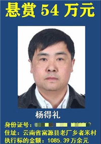 這名被懸賞 54 萬元舉報的被執行人叫楊得禮,被執行標的為 1085.39 萬元,是云南省富源縣老廠鄉者米村人。