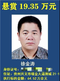楊得禮是此次懸賞 15 人中 " 最值錢 " 的一個,其次為徐金濤,住址為興義市瑞金大道澳城 21-1,執行標的為 64.52 萬余元,被懸賞 19.35 萬元。第三為懸賞金額 11.48 萬元的楊真俊,住址為興義桔山街道辦永興村,執行標的為 114.84 萬余元。