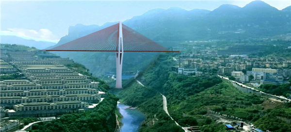 根據設計,美酒河特大橋設計為一座主跨285+235(米)的單塔雙索面斜拉橋,主塔標高318米,足有106層樓的高度,全長536米,橋面寬23.2米,雙向四車道,按二級公路標準設計,設計時速為40公里。項目估算總投資4.4億元。