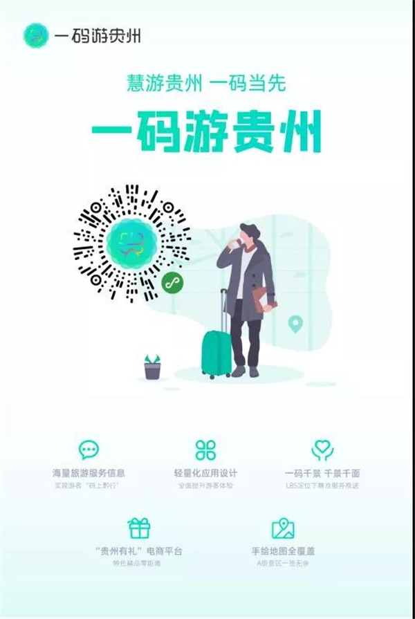 “一碼游貴州”全域智慧旅游平臺以大數據、5G直播、新零售、區塊鏈等多項前沿科技為支撐,以輕量化載體小程序為入口,通過一個二維碼廣納貴州文化和旅游信息資源,涵蓋千種景觀、千種風味、千種風物,將專業化的旅游資訊、個性化的產品服務、前沿化的科技感知進行多維度、立體、精準的傳播,為廣大游客提供“吃、住、行、游、購、娛”等方面的智慧旅游服務,全面提升游客的入黔旅游體驗,讓游客無需下載、安裝和存儲,輕松愉悅就能即刻享受到“掃碼即達”的貴州之旅,全面構建貴州“科技革命+文旅創新”的全域智慧旅游新模式。