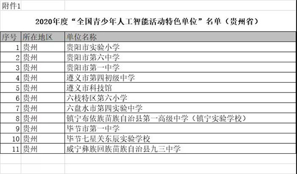 名單顯示,貴州省入選的11家單位分別為:貴陽市實(shí)驗(yàn)小學(xué)、貴陽市第六中學(xué)、貴陽市第一中學(xué)、遵義市第四初級中學(xué)、遵義市科技館、六枝特區(qū)第六小學(xué)、六盤水市第四實(shí)驗(yàn)中學(xué)、鎮(zhèn)寧布依族苗族自治縣第一高級中學(xué)(鎮(zhèn)寧實(shí)驗(yàn)學(xué)校)、畢節(jié)市第一中學(xué)、畢節(jié)七星關(guān)東辰實(shí)驗(yàn)學(xué)校、威寧彝族回族苗族自治縣九三中學(xué)。