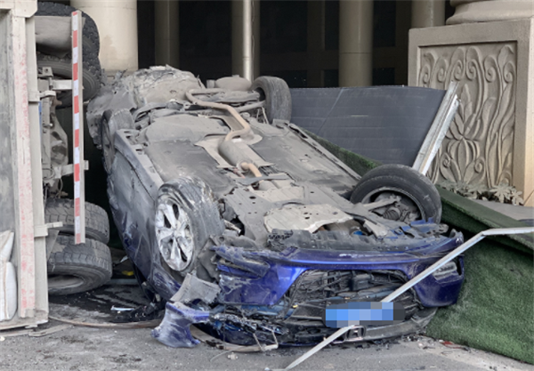 記者了解到,事故發生時,肇事貨車最先撞上藍色本田轎車,又推著這輛本田轎車向前繼續一路撞開了三四輛其他車之后,才側翻停下。本田轎車被大貨車推向路邊翻了個底朝天。