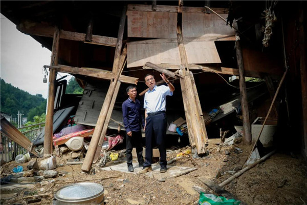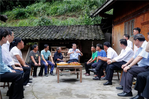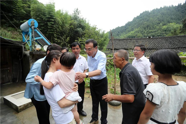 李克強沿途察看被泥石流沖蝕的掛坡地,聽取相關負責人對貴州、銅仁等地的洪澇災情匯報,要求有關部門加大對救災重建工作的資金支持�?偫碜詈髞淼酱迕窭钣肋M院中與當地村民進行座談。