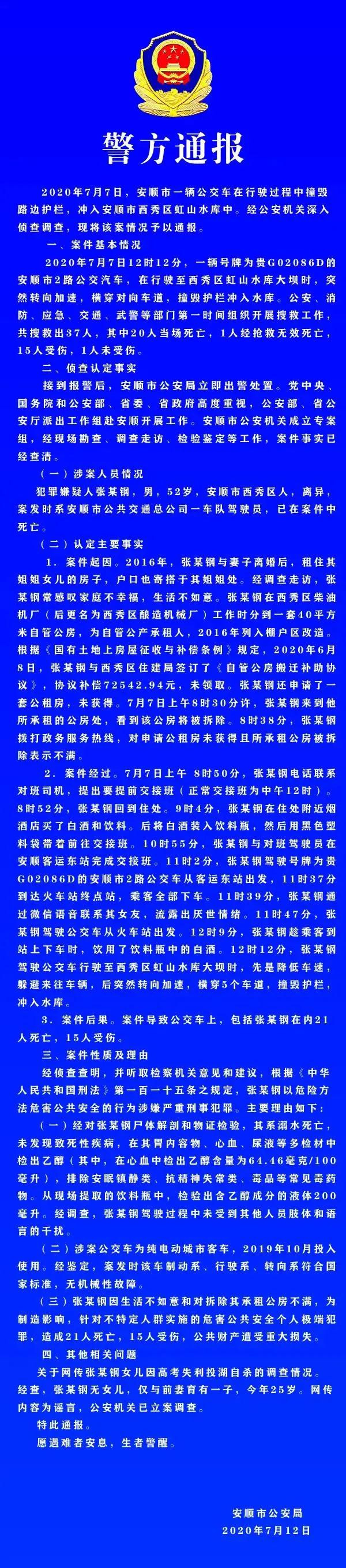 警方通報安順公交車墜湖事件:司機蓄意報復社會