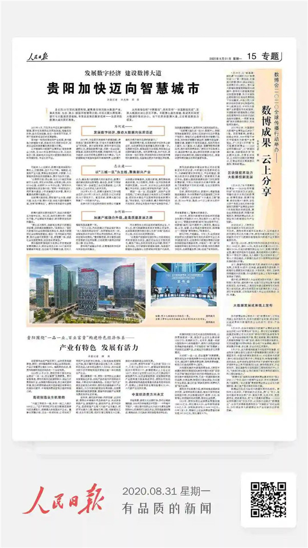 8月31日,《人民日報》專題聚焦貴州貴陽大數(shù)據(jù)產(chǎn)業(yè)發(fā)展,刊發(fā)《發(fā)展數(shù)字經(jīng)濟 建設(shè)數(shù)博大道 貴陽加快邁向智慧城市》《數(shù)博會二〇二〇全球傳播行動舉辦——數(shù)博成果 云上分享》《貴陽圍繞“一品一業(yè)、百業(yè)富貴”構(gòu)建特色經(jīng)濟體系——產(chǎn)業(yè)有特色 發(fā)展有活力》,圍繞貴陽數(shù)博大道建設(shè)、“永不落幕的數(shù)博會—2020全球傳播行動”和貴陽圍繞“一品一業(yè)、百業(yè)富貴”構(gòu)建特色經(jīng)濟體系等方面,全面介紹貴州發(fā)展大數(shù)據(jù)產(chǎn)業(yè)取得的豐碩成果及貴陽因地制宜,堅持“一張藍圖繪到底”,發(fā)展大數(shù)據(jù),從西南省會到“中國數(shù)谷”蛻變。具體報道如下: