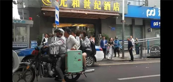 “4個人擠在摩托車上,還帶著3個行李箱。一個行李箱放在摩托車油箱上,行李箱都抵住了司機的下巴。司機身后兩名男子一人單手提一個行李箱放在車身兩側,車尾延伸出來的鐵架上還坐著一名女性,遠看上去,她就像‘漂浮’在空中一樣。”民警說。