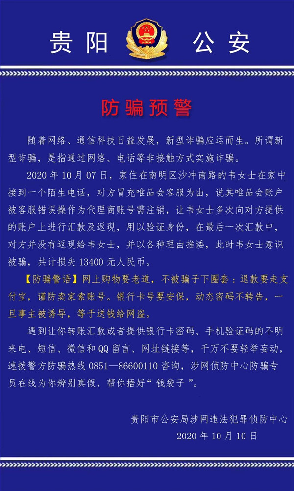 貴陽警方發(fā)布預警,教您識別騙術,遠離詐騙侵害,有疑問請撥打反詐專線86600110,反詐專員在線幫你捂好“錢袋子”。