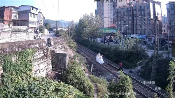 10月24日16時許,貴陽鐵路公安處息烽車站派出所民警對線路開展視頻巡查時,突然發現川黔線K351公里處有幾名男女站在鐵道間拍婚紗照。