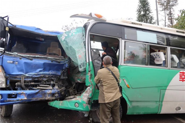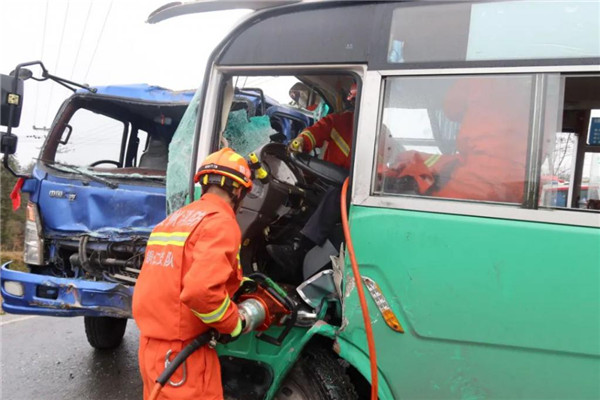 當天 10 時 25 分,德江縣長征南路消防救援站接到報警電話稱,當地煎茶鎮往合興鎮方向的道路上,一輛客運中巴車與一輛滿載沙土的貨車相撞,客車司機被困,車上多名乘客受傷無法移動。接到報警后,消防救援人員立即趕赴現場救援。