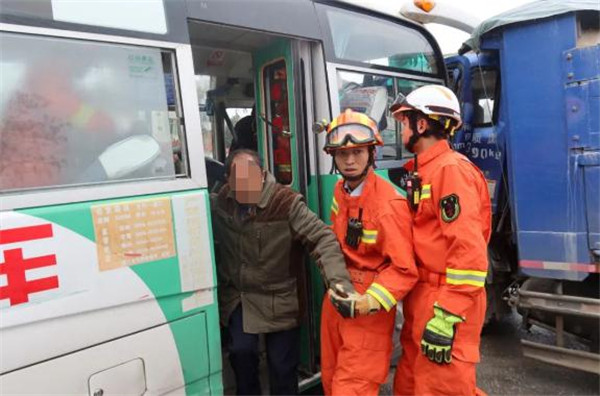 到達現場后發現,兩車因劇烈撞擊車頭嚴重變形,客車司機被卡在駕駛位上,無法脫困,車上 7 名乘客不同程度受傷且部分出現暈厥。