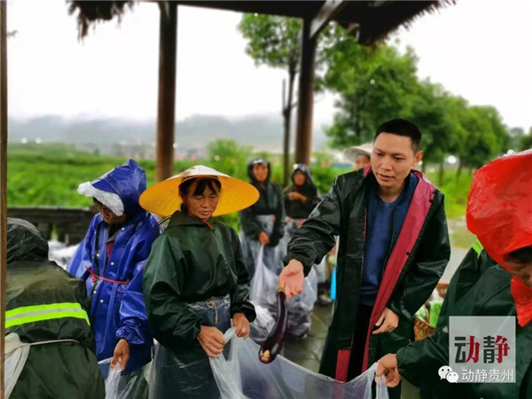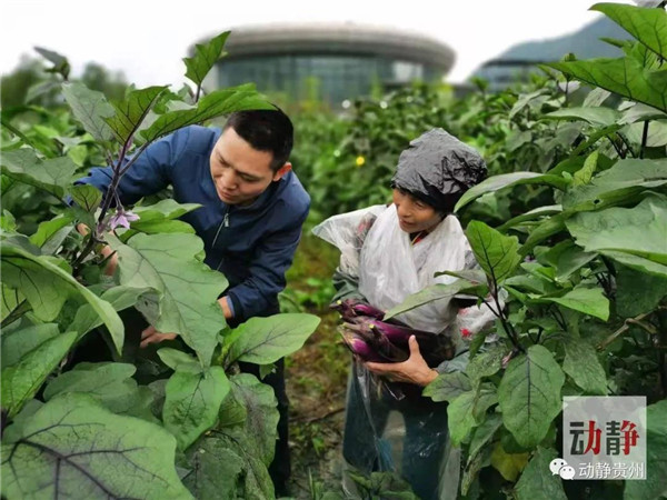 余永流(左一)在田間幫助群眾采收茄子