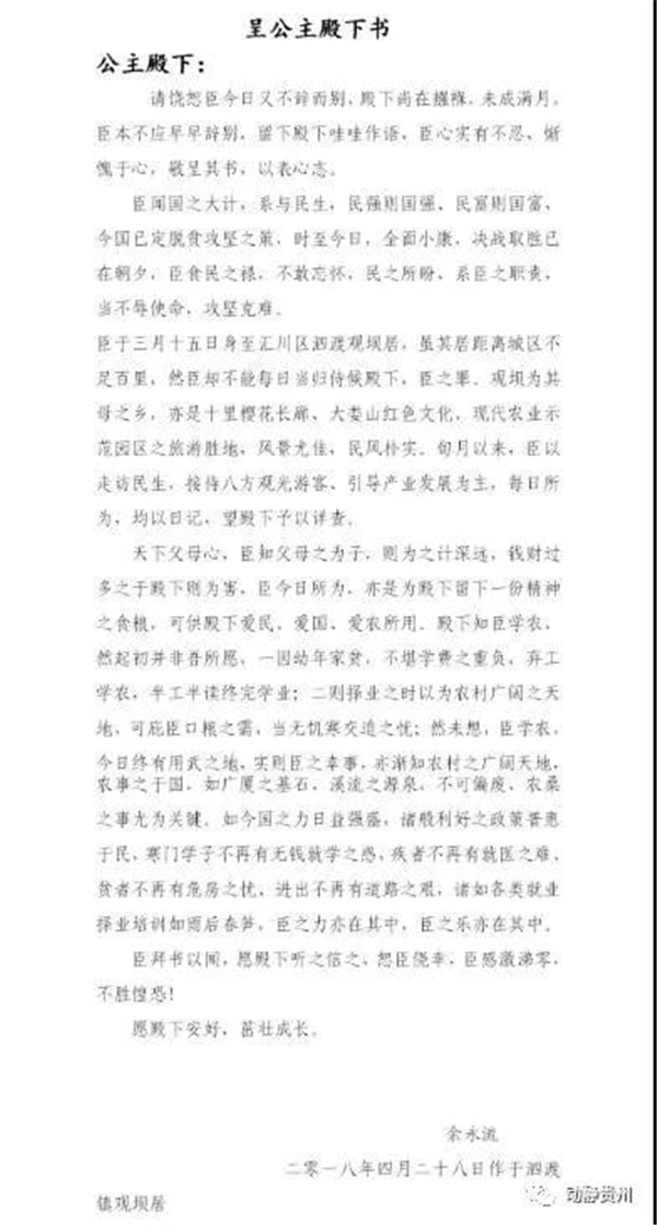 這封《呈公主殿下書》,是2018年4月28日,余永流在小女兒出生21天后寫給她的信。當時,他作為遵義市匯川區(qū)農業(yè)農村局的工作人員,到泗渡鎮(zhèn)觀壩村駐村才50多天。信里,他這樣寫道: