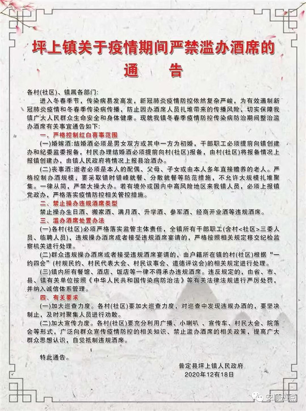 安順普定縣坪上鎮發布了關于整治濫辦酒席的通告