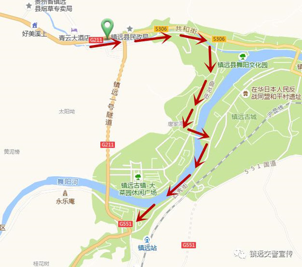 前往蕉溪、青溪、施洞、江古方向的小型車輛繞行共和街→盤龍街→平冒街→國道551鎮福線(即鎮遠政務中心路口) 。