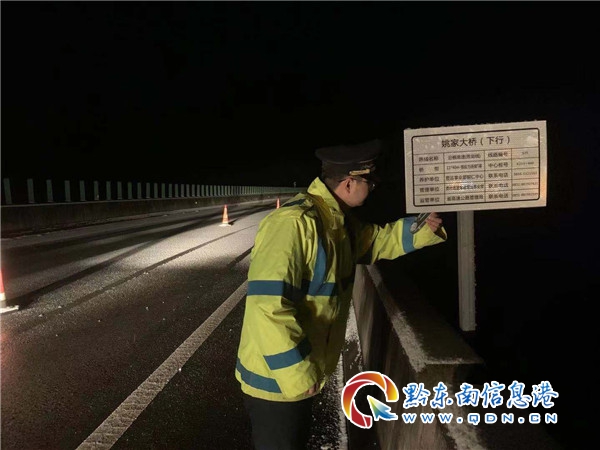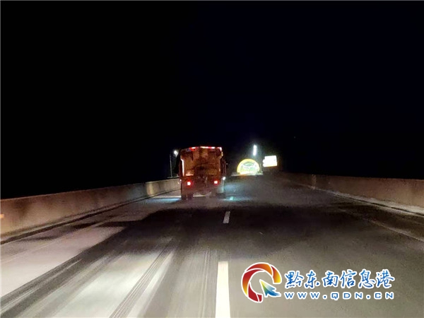 3日23時許,天氣雨夾雪,巡邏的民警發現沿榕高速鎮遠段易凝凍路段234千米處氣溫已經降至零度,路面已有些許凝凍跡象。隨后立即啟動撒鹽除工作預案,于當晚凌晨1時許,開展一路多方沿線預防性撒鹽行動,撒鹽行動由兩輛警車帶道壓速,雙向循環式撒鹽,撒鹽結束后,路面易凝凍路段收到良好效果,截止12月4日凌晨4時許,暫未發現路面凝凍路段。