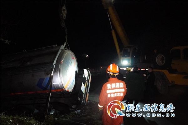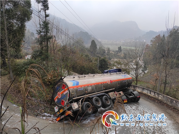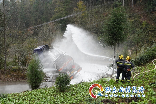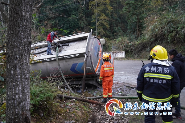 鎮(zhèn)遠(yuǎn)縣805縣道都坪鎮(zhèn)天印村路段,一輛載有28噸輕循環(huán)油油罐車發(fā)生傾斜泄漏事故,情況萬分緊急。接警后,