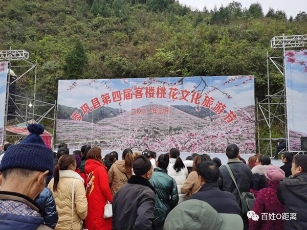 開幕現場非常熱鬧,人山人海,盛況空前。滿山遍野的桃花錯落在白家壩村的各個山坡上,像灑落人間的霓裳羽衣。