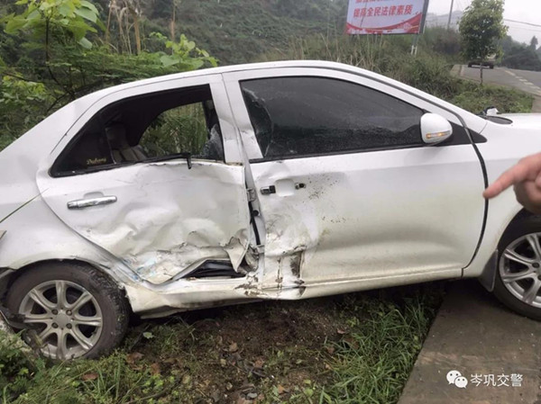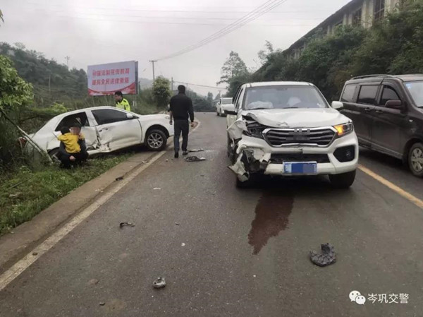 經了解,岑鞏縣凱本鎮的楊某駕車載著自己的兒子去注溪鎮一水庫釣魚,由于當天路面濕滑速度過快撞上了對向由陸某正常行駛的皮卡車,造成皮卡車右側車頭損壞,機油也漏了出來,擋風玻璃破裂,安全氣囊已彈出;楊某駕駛的小轎車右側車門嚴重變形,已經凹陷,車窗玻璃破損,車內的魚餌料散落在后座上,車輛被彈在了路肩外的草叢中,車輛左后輪已懸空,外面就是十幾米高的水溝。