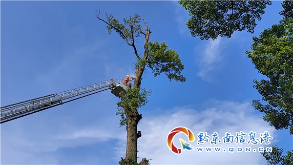 消防指戰(zhàn)員到達(dá)現(xiàn)場后發(fā)現(xiàn),最靠近圍墻邊的一棵樹最大,樹干枝丫很粗大,分布復(fù)雜,樹的頂端一部分已經(jīng)腐朽了,處置起來十分困難,其余3棵靠近居民住房,現(xiàn)場群眾敘述,一到刮風(fēng)下雨,樹就被風(fēng)吹的搖來晃去,感覺就要被吹斷倒下來,家里都是些老人,子女都出去務(wù)工了,而且老人行動(dòng)也不方便,之前家里也請伐木工人來處理,但也只是剃了個(gè)枝丫,沒有徹底清除隱患。