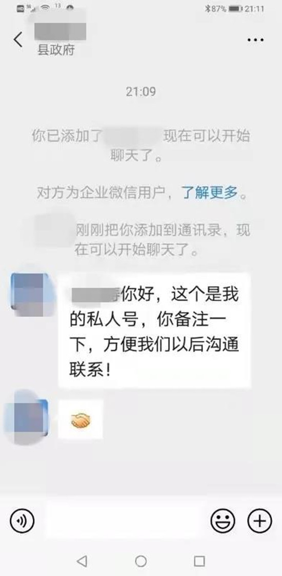 以下圖片為詐騙嫌疑人冒充縣領導微信截圖:
