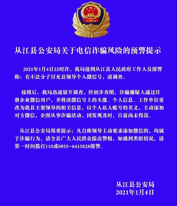 接報后,從江縣公安局迅速展開調查,經初步查明,詐騙嫌疑人通過注冊企業微信用戶,并將該微信號上的頭像、個人信息、工作單位更改為從江縣主要領導的相關信息,以個人私人賬號的名義,主動添加對方微信,企圖從事詐騙活動,因發現及時,目前尚未得逞,相關情況正在進一步調查中。