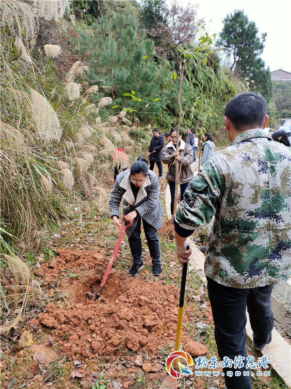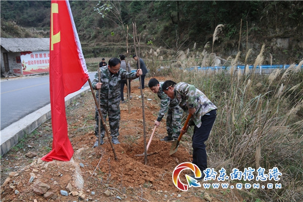 植樹現場,黨政班子成員身先士卒,廣大干部群眾干勁十足,每道工序緊密銜接、相互配合,大家三人成組、五人成團,有的揮鍬鏟土、有的搬樹苗、有的扶樹壓土、有的提水澆灌,有條不絮的栽下一棵棵樹苗,經過大家的辛勤勞動,150余株桂花樹苗在貫慶鄉村公路兩側錯落有致、迎風挺立扎下了根,按間隔3米,依次向公路兩側延伸,為貫慶公路增添了一抹抹新綠,植樹現場呈現出春天里一派勃勃生機的景象。