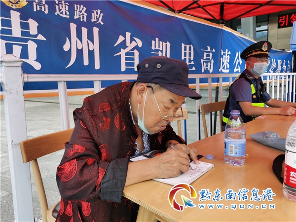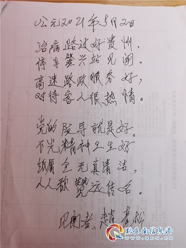 本網(wǎng)訊 2021年5月2日11時(shí)許,在G76廈蓉高速肇興服務(wù)區(qū)的“五一”便民服務(wù)點(diǎn),一位老人文思泉涌、筆下生花,為正在現(xiàn)場(chǎng)值守的從江高速路政工作人員“作詩(shī)”點(diǎn)贊,成為一道溫馨而獨(dú)特的風(fēng)景線。