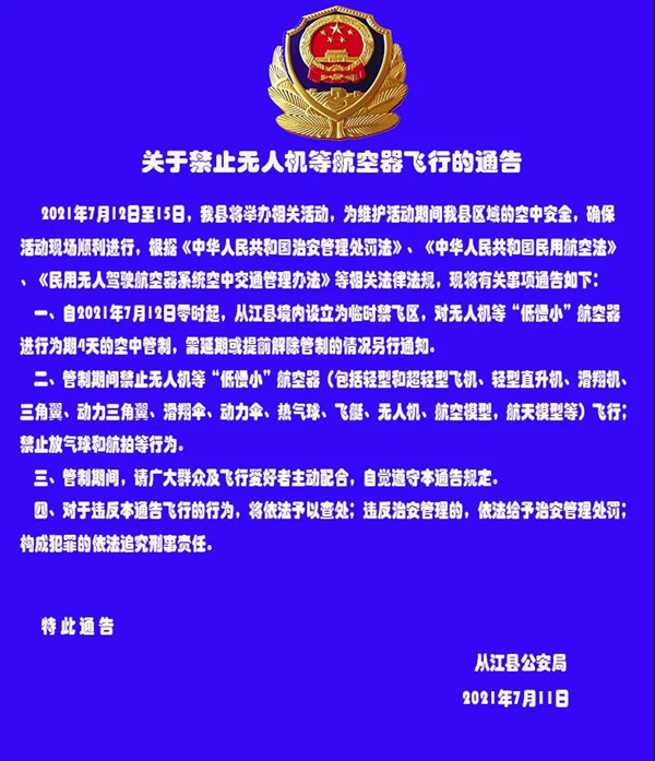 注意!從江縣發布關于禁止無人機等航空器飛行的通告