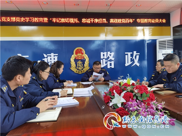 會上,黨支部書記劉翔宣讀了《中共凱里高速公路管理處丹寨路政執法大隊支部委員會關于成立黨史學習教育領導小組的通知》,解讀了《丹寨路政執法大隊“牢記殷切囑托、忠誠干凈擔當、喜迎建黨百年”專題教育實施方案》。劉翔指出,黨員要切實增強開展黨史學習教育的政治責任感和歷史使命感,要深刻領會和把握黨史學習教育的重大意義,進一步強化政治擔當、扛起政治責任、把穩政治方向,為實現貴州交通高質量發展提供強大精神動力。