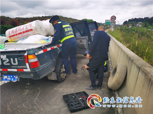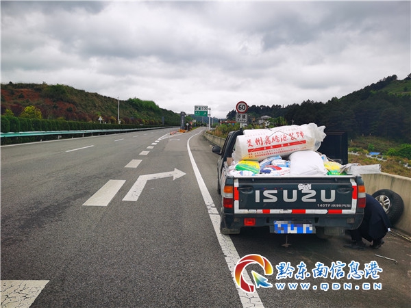 本網(wǎng)訊 2021年4月5日上午,清明節(jié)假期凱里高速公路管理處丹寨路政執(zhí)法大隊(duì)路政員加強(qiáng)路面巡查,當(dāng)巡查至S62余冊(cè)高速丹寨至凱里段K114+100上行處時(shí),發(fā)現(xiàn)在興仁服務(wù)區(qū)入口車道上停著一輛皮卡車,車輛向后切斜車旁有人正在焦急的彎腰檢查著右側(cè)后輪。