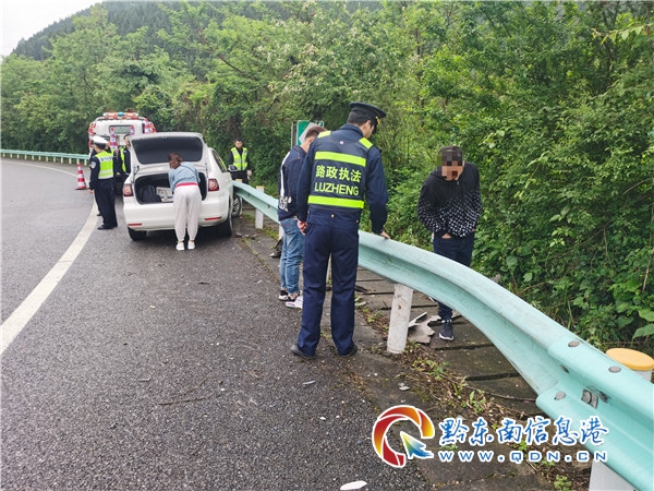 4月18日14時17分,凱里高速公路管理處丹寨路政執(zhí)法大隊報警電話突然響起,電話那頭一個急促的聲音說:“我們從三都去都勻路上在互通匝道撞到了護攔,你們快來救救我們”。放下電話路政員立即趕赴現(xiàn)場并同時電話通知轄區(qū)高速交警和應(yīng)急救援隊。