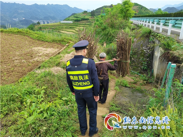 于是,路政員耐心向老人講解進入高速公路的危害和在高速公路上砍伐綠化帶的危害,私自進入高速公路,極易引發交通安全事故。在高速公路綠化帶拾取枯枝或砍伐綠化帶,一方面會破壞綠化,另一方面會影響沿線行車安全,根據《公路安全保護條例》第二十六條規,禁止破壞公路、公路用地范圍內的綠化物。經路政員一番的耐心宣傳后,老人深深意識到自己的錯誤,向路政員表示今后不會再進入高速和在高速公路拾取和砍伐柴禾,同時也表示回家后會及時告知家人不要犯類似的錯誤。當路政員主動要求幫助老人將已捆扎的柴禾挑離高速,老人執意不肯,要求自己挑離。為將老人平安護送下高速,路政員要求老人在道路白線外的路肩或者邊溝蓋板上行走,路政員則在白線內側的應急車道護送,最終將老人平安送下高速公路。