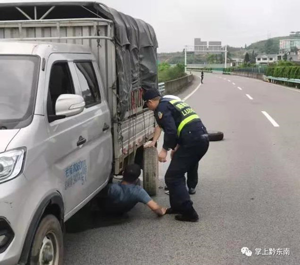 見此情況,路政員立即靠邊停車前去查看情況。經詢問,貨車運載幾十頭小豬仔從三都前往黃平,車行到此處突然爆胎,所幸駕駛員經驗豐富,抓緊方向盤緊急處置才沒有造成交通事故。見狀一名路政員立即前往故障車輛后方指揮過往車輛安全通行;另一名路政員協助駕駛員更換輪胎,15分鐘左右,該故障車輪胎更換完畢,得以安全駛離,道路恢復正常通行。