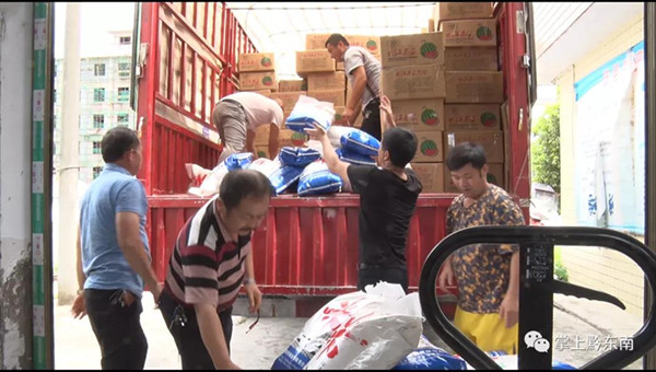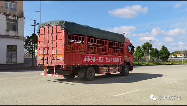 經過10多個小時的車程,6月15日上午九時,貨車緩緩駛入南海桂城糧油超市停車站,兩輛貨車車身分別懸掛著“南海丹寨一家親、共克時艱戰疫情”“疫情無情人有情,丹寨南海心連心”字樣的橫幅。