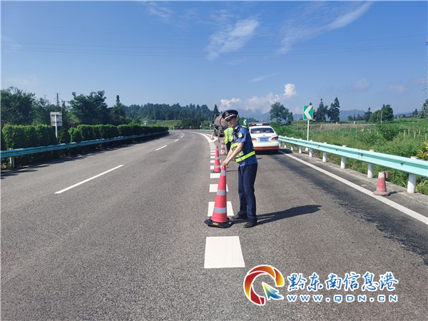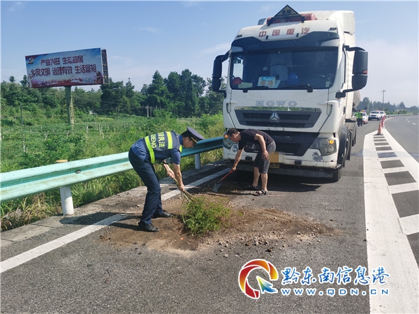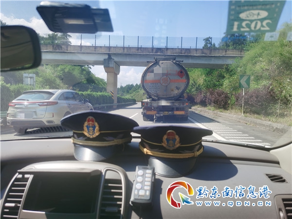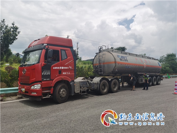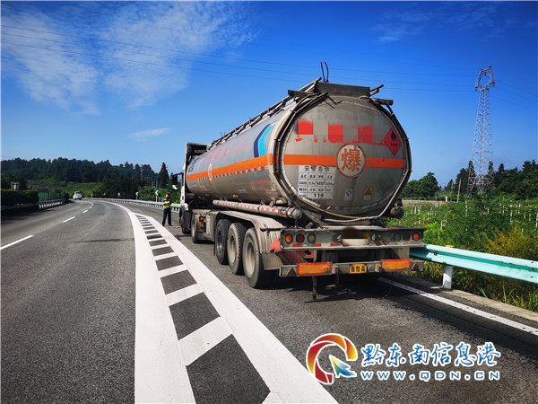 7月21日8時50分,凱里高速公路管理處丹寨路政執法大隊接到報警電話稱,在興仁至丹寨之間,有輛裝有28噸柴油的危化品運輸車輛故障,無法繼續行駛,當班路政員立即趕赴現場。