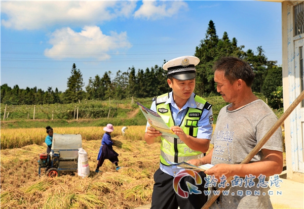 本網訊 連日來,各地農民趁著晴好天氣搶收稻谷,9月10日,貴州省黔東南苗族侗族自治州丹寨縣交警大隊組織宣傳民警深入田間、曬谷場,向農村群眾宣傳道路交通安全知識,尤其是農用車、三輪車違法載人、人貨混裝、超載等交通違法行為存在的安全隱患,為農民秋收保駕護航。(陸德華)