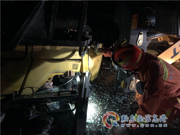 消防指戰員趕到現場后,發現一名鏟車司機被牢牢壓在駕駛座椅下,腿部被方向盤卡住,無法動彈,油箱還在不斷漏油,車子隨時往下沉的可能,情況危急。