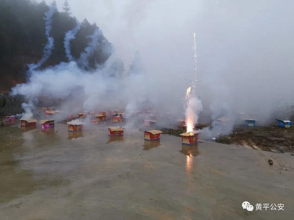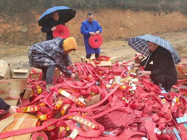 2月9日下午,黃平縣公安局治安大隊對行動中收繳的非法煙花爆竹在黃平縣城郊五里墩進行集中銷毀,縣委常委、政法委書記彭光明,縣人民政府副縣長、局黨委書記、局長李輝到現場督導銷毀。