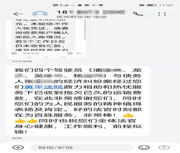 “我們與債務人的經濟糾紛案經過你們的鼎力相助和熱忱服務下已經收到拖欠已久的運輸費款。在此非常感謝您們,同時為你們為人民服務的精神值得表揚及肯定!”10月19日一大早,申請人潘某等人如約收到了履行的案款,高興地發給黃平縣法院執行法官這樣的一條消息,表達對法院感激之情,此次,該起案件終于圓滿結束。
