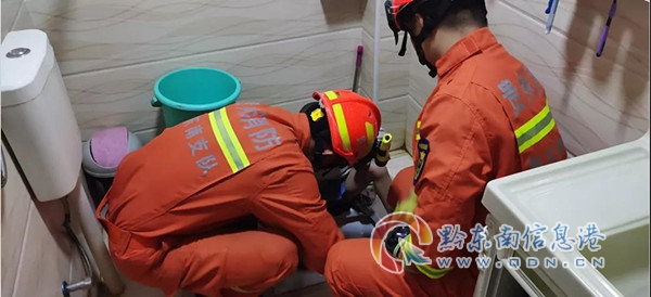 本網訊 10月10日21時56分,劍河縣消防救援大隊接到指揮中心轉警,位于劍河縣未來城對面,有一小孩腳被卡在廁所,請到場救援,接警后劍河縣消防救援站立即出動1車7人前往救援。