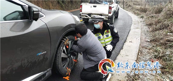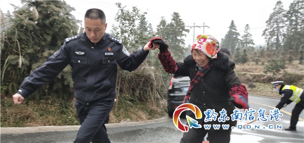 1月7日上午,地處海拔較高的錦彥線橋問路段,因交通管制,兩名老人徒步返家途經嚴重結冰路面時舉步維艱。當時正在凝凍路面撒鹽除冰的縣公安局黨委委員、黔東南州公安局錦屏縣經濟開發區分局局長范修屏發現老人困境后,喊道:“老人家把手給我,注意安全,我拉你過去”。范修屏同志拉著老人的手一步一步往安全區域挪,并在執勤人員的安全護送下,兩名老人得以安全返回。