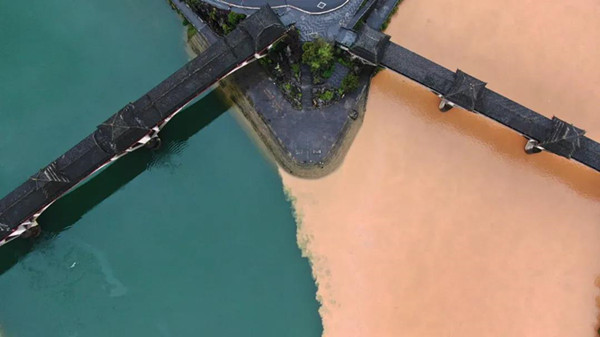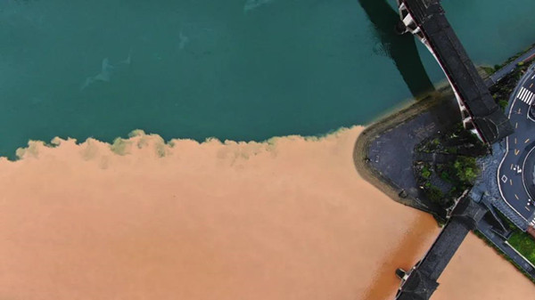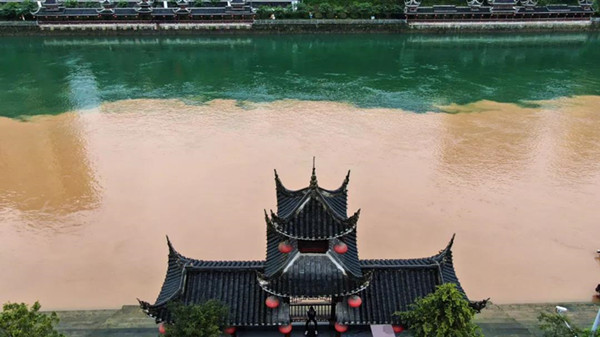 4月15日,受強降雨影響,位于錦屏縣三江鎮的清水江和小江交匯處一清一濁,呈現出“涇渭分明”的景觀。