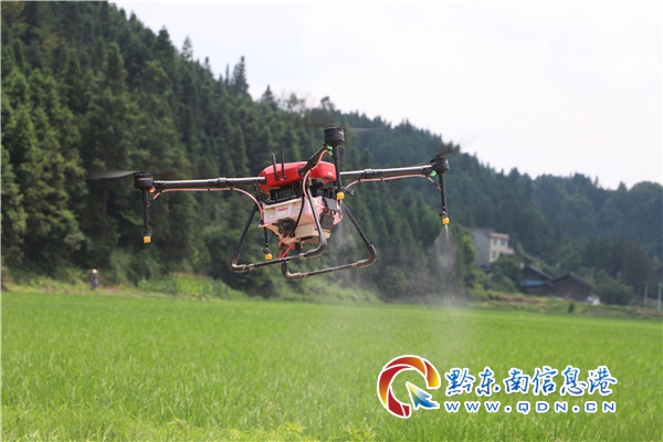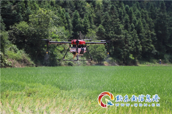 本網(wǎng)訊 6月23日,在貴州錦屏縣銅鼓鎮(zhèn)嫰寨村的稻田上空,植保無(wú)人機(jī)正在進(jìn)行水稻病蟲害飛防作業(yè)。