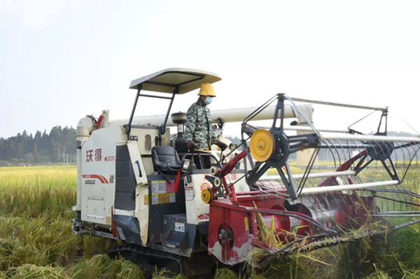 在敦寨鎮亮司優質稻種植農民專業合作社稻田里,收割機正在進行收割作業,加快秋糧搶收,運往錦屏縣糧食購銷公司敦寨糧食儲備庫完成訂單交付。