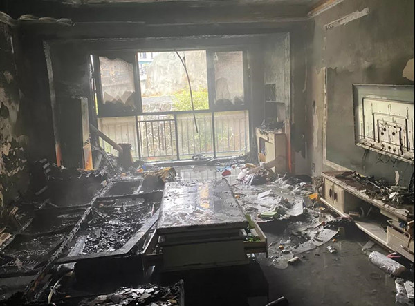 到場后,經偵查發現,起火部位為客廳,根據現場情況,消防救援人員立即架設水槍陣地,內外夾攻,經過近20分鐘的處置,成功將火勢撲滅。