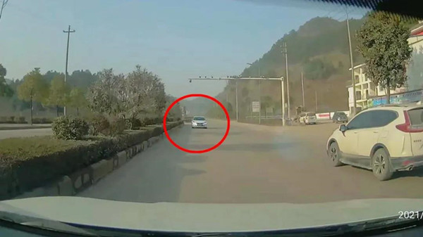 視頻畫面顯示,1月14日上午9時39分許,一輛白色轎車在爐碧東大道(新華村委會路口處)逆向行駛。