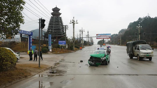 民警趕到現場后,發現一輛出租車停放在十字路口處最右側車道,車頭受損嚴重,出租車乘客輕微受傷;另一邊的一輛面包車側停在貴龍客車廠路口。民警隨即通知了救護車來將乘客接去醫院檢查傷勢。