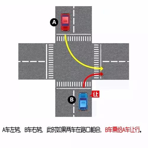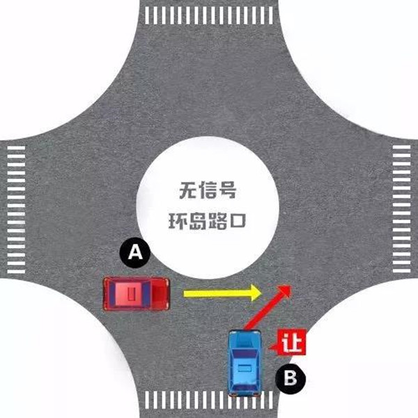 1.在無信號燈控制的環島路口,B車需讓A車先行。