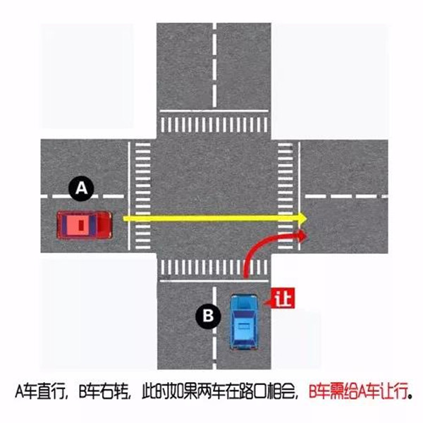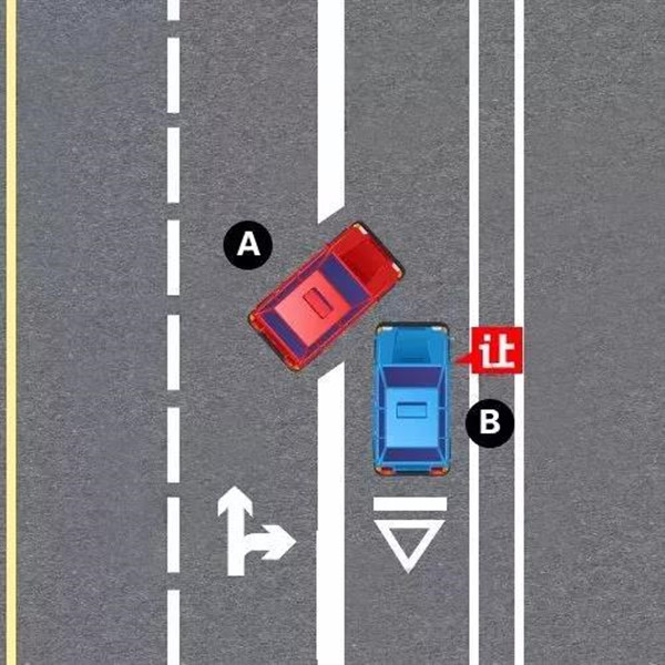 上圖中,A車正在轉向駛出,B車雖然正在直行,但B車行駛路的路面上有倒三角讓行標志,所以B車應讓行A車。
