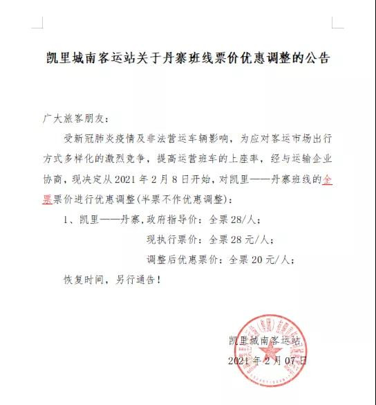 受新冠肺炎疫情及非法營運車輛影響,為應對客運市場出行方式多樣化的激烈競爭,提高運營班車的上座率,經與運輸企業協商,現決定從2021年2月8日開始,對凱里——丹寨班線的全票票價進行優惠調整(半票不作優惠調整):